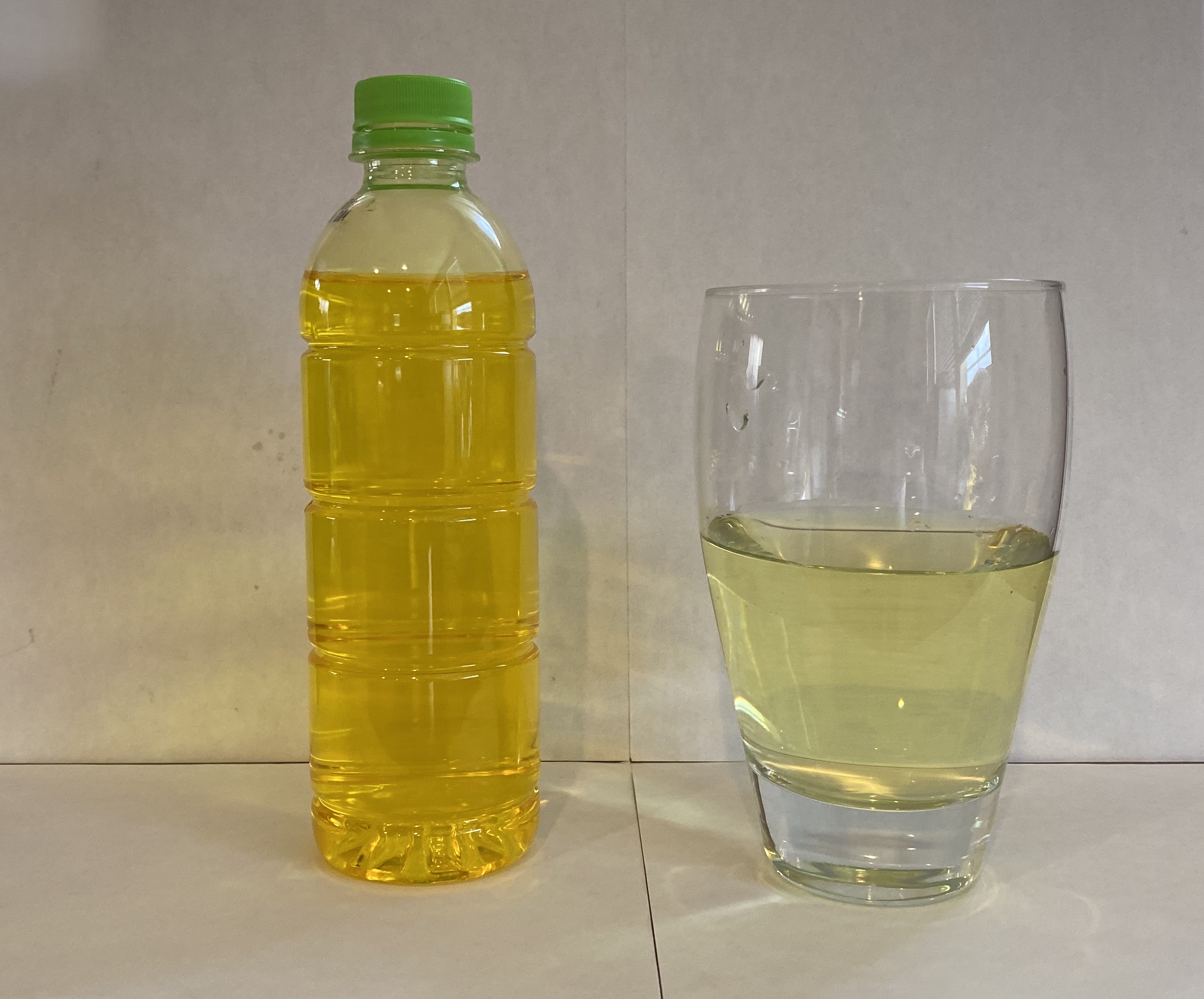 左邊是CDS原液,右邊是稀釋40倍後的稀釋液。混合比例:5ml 原液 + 195 ml 水。總和是200 ml的稀釋液。 |